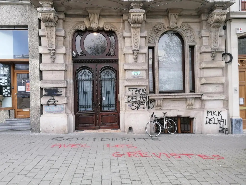 En début de manifestation, sur l’avenue Henri Jaspar, des manifestant·es ont endommagé la façade de laChambre nationale des huissiers de justice. Un tag a été écrit devant le bâtiment, en solidarité avec les grévistes de chez Delhaize, qui rentrent maintenant dans leur 8e semaine de lutte contre la franchisation de plus de 120 grands supermarchés. A plusieurs reprises, des huissiers ont été appelés à lever leurs piquets de grève sous peine d’amendes colossales, l’action semble donc avoir été menée en réaction. Depuis le 3 mai une décision de justice a par ailleurs interdit les piquets de grève sur l’ensemble des magasins.