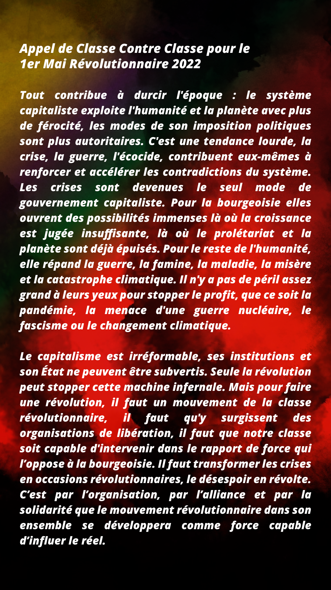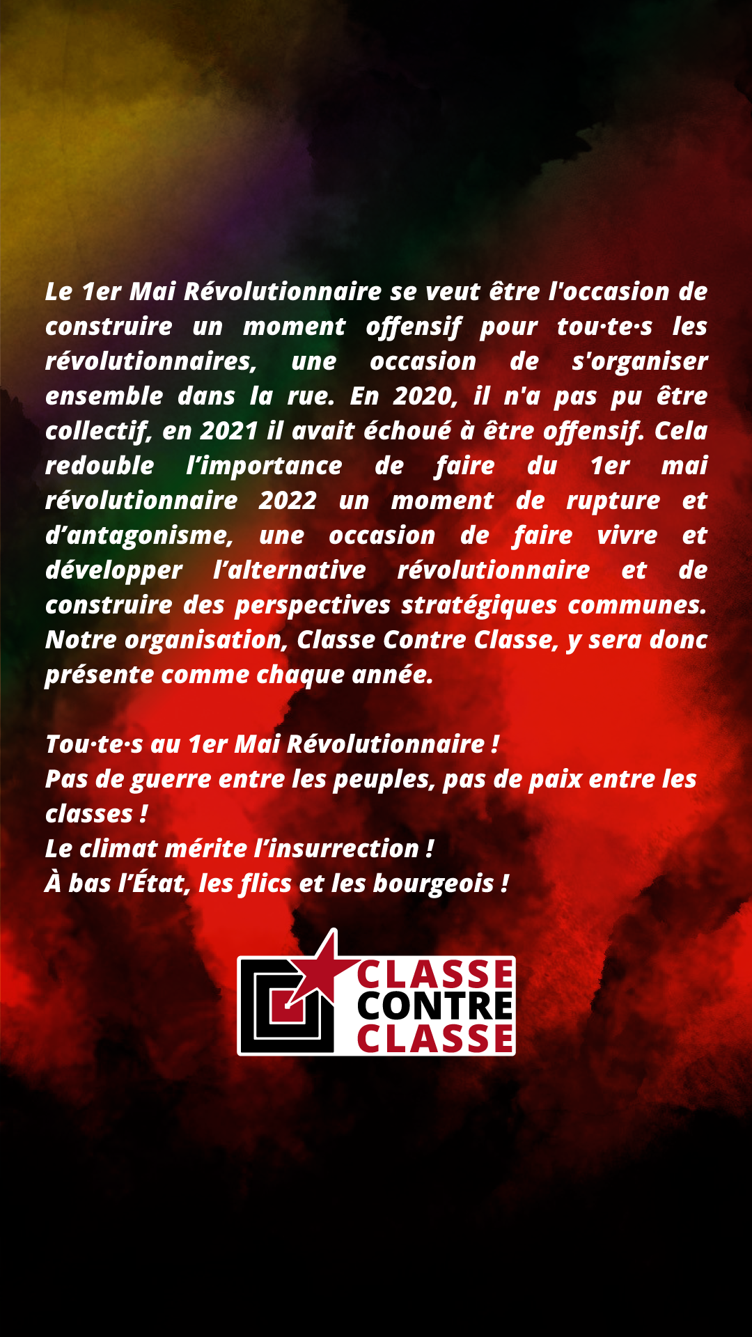 Le 1er Mai Révolutionnaire se veut être l’occasion de construire un moment offensif pour tou·te·s les révolutionnaires, une occasion de s’organiser ensemble dans la rue. En 2020, il n’a pas pu être collectif, en 2021 il avait échoué à être offensif. Cela redouble l’importance de faire du 1er mai révolutionnaire 2022 un moment de rupture et d’antagonisme, une occasion de faire vivre et développer l’alternative révolutionnaire et de construire des perspectives stratégiques communes. Notre organisation, Classe Contre Classe, y sera donc présente comme chaque année.